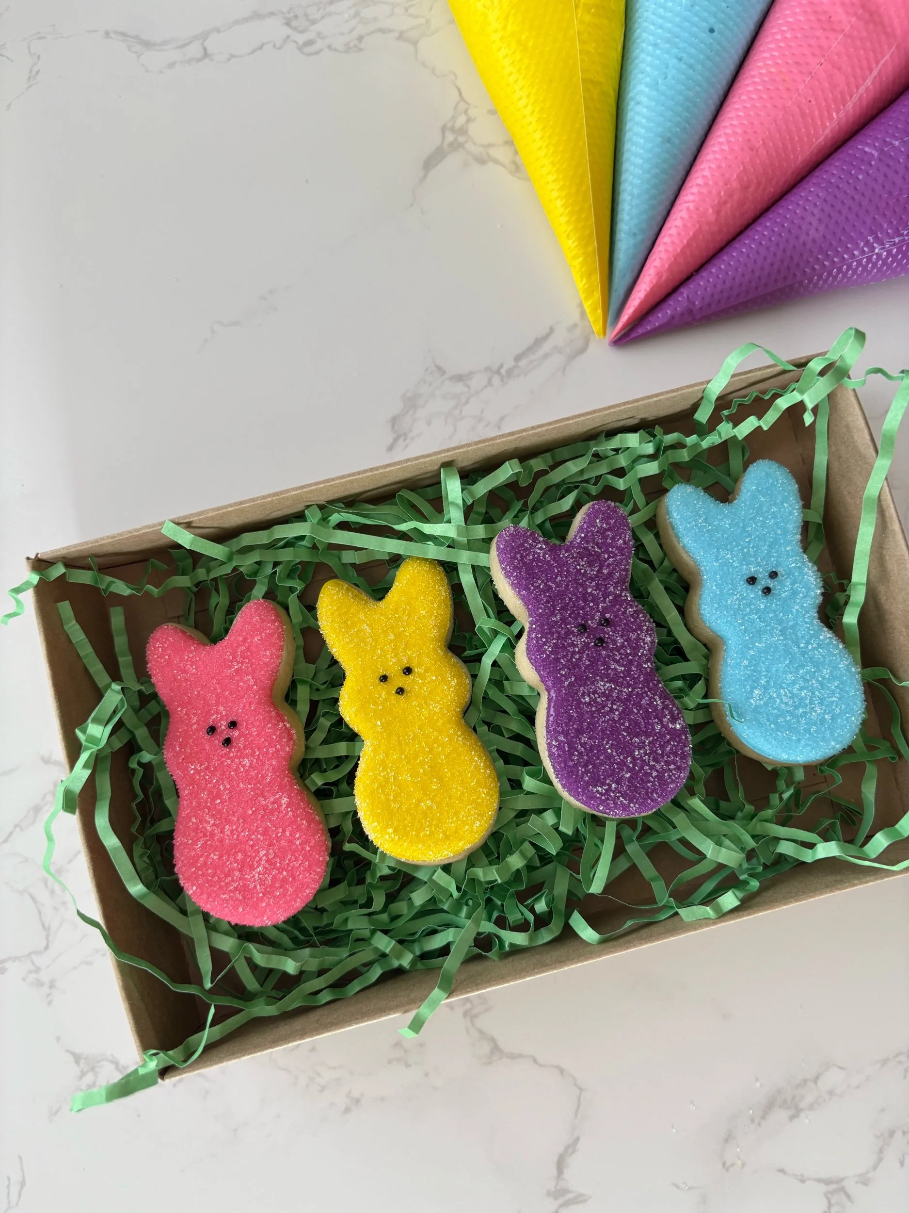 Four pack of colorful peep cookies bringing all the pastel Easter vibes. Soft, sweet, and ready to hop into baskets or onto your brunch table.